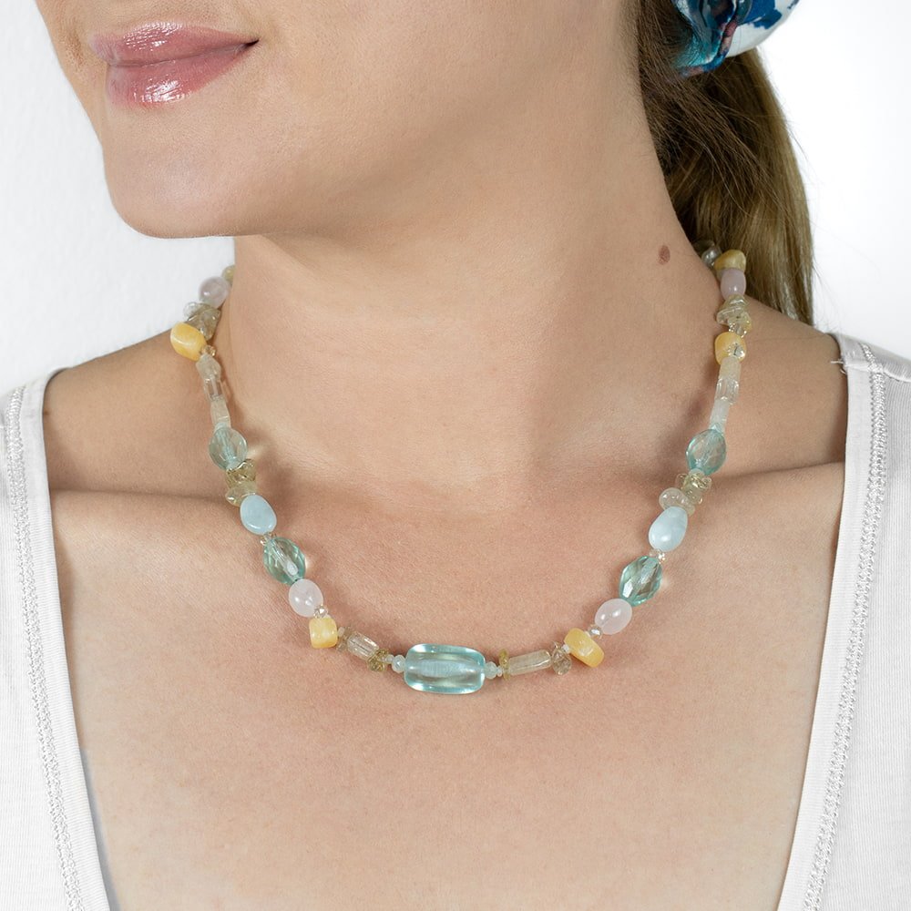 The piece features hand-selected semi-precious beads: blue topaz, morganite, citrine, rutilated quartz, and yellow calcite.