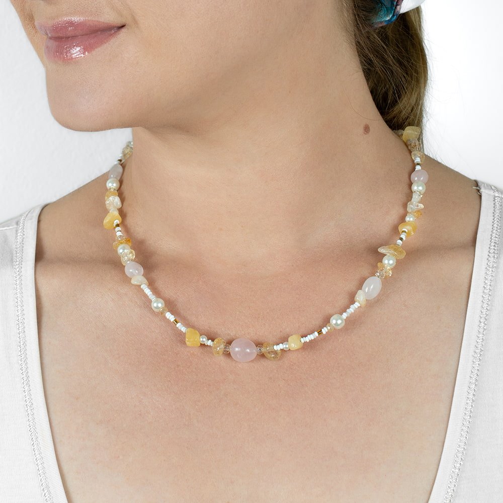 Introducing our Harmony semi-precious gemstone beaded necklace with sterling silver fixings, featuring hand-selected semi-precious beads including morganite, citrine and yellow calcite.