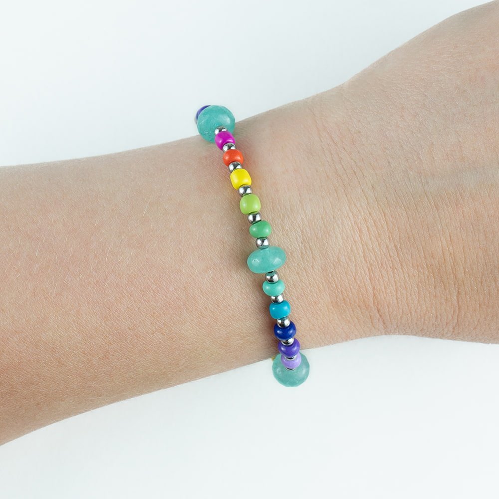 The Indra chrysoprase semi precious gemstone rainbow beaded bracelet is a radiant burst of colour.
