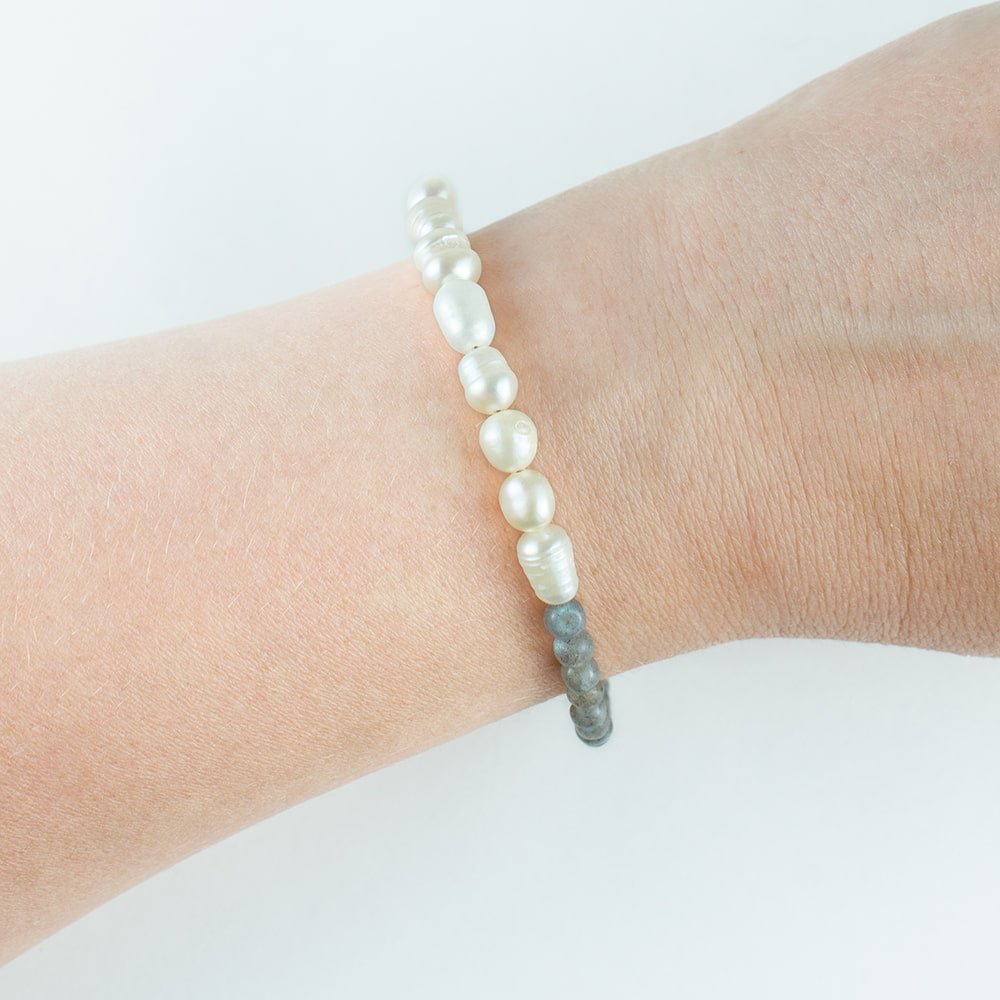 The Trinity semi-precious gemstone beaded bracelet combines a striking combination of lustrous labradorite, sparkling electroplated faceted hematite and beautifully irregular freshwater pearls.